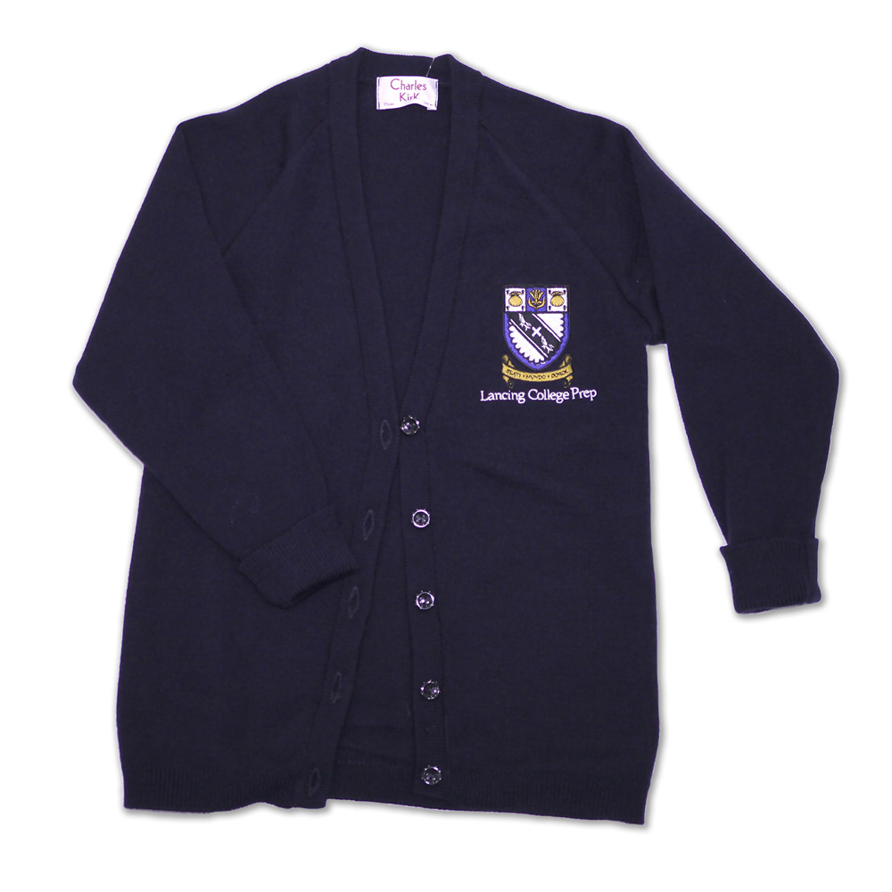 Navy cardigan, 100% acrylic, raglan sleeves, button front, fold over cuffs, ribbed band for buttons and holes, bespoke with Lancing crest and text.