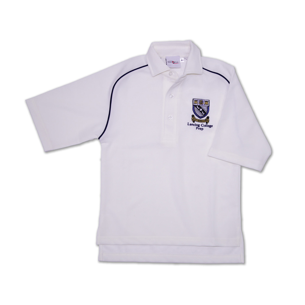 Lancing Prep at Worthing only, Cricket shirt, off-white, 3/4 length sleeves, 100% polyester, light weight fabric, collar, and button neckline, bespoke with Lancing crest and text (Summer Term only). Product may vary from Photo.