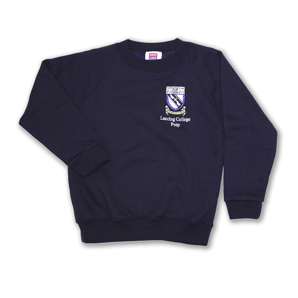 Navy sweatshirt, 60% Cotton/ 40% recycled polyester, 100% of polyester content is made from recycled plastic bottles, fabric blend for super soft handle, durable and high performing colour-fast fabric, unisex, ribbed collar, cuff & hem part of our Eco-uniform range. Bespoke to Lancing with crest and text.