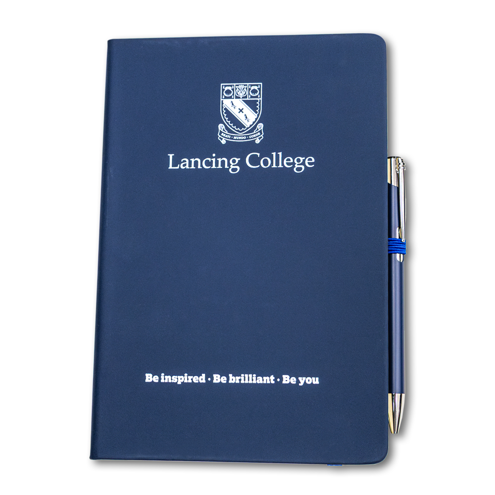 Navy hardback note book and pen attached on the side crested with Lancing College.