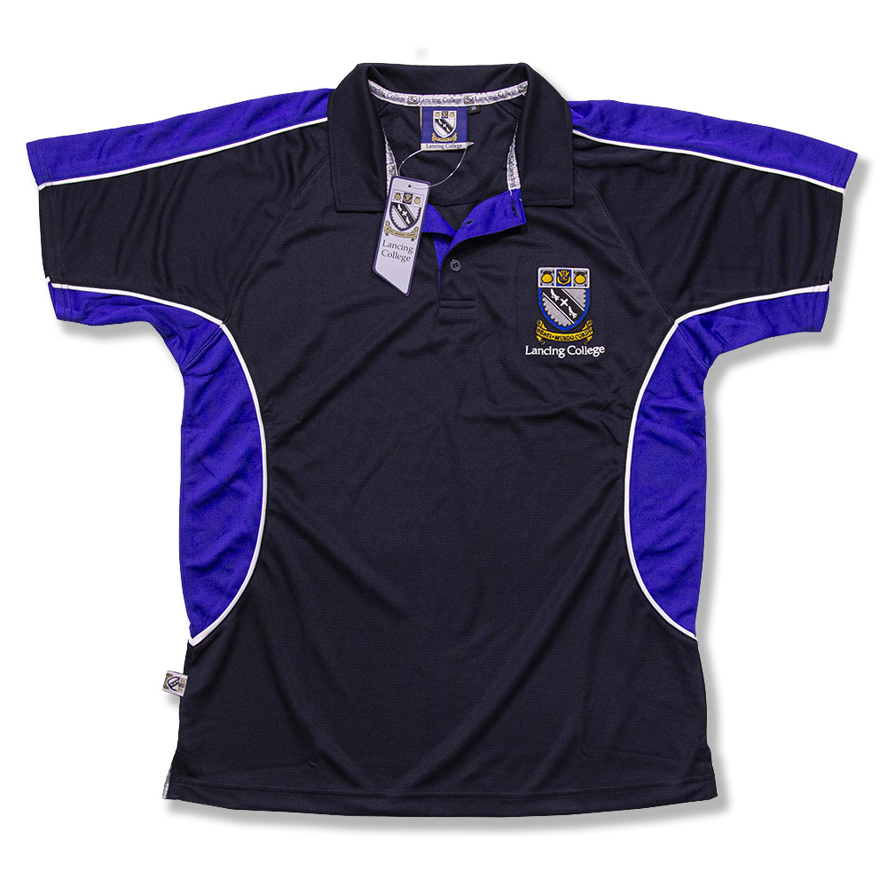 Female fit navy polo shirt. Maximum performance, our exclusive sports shirt will ensure you feel and look part of the squad. Climate moisture management system. 100% polyester, bespoke with Lancing crest. Product brand may differ from that illustrated.