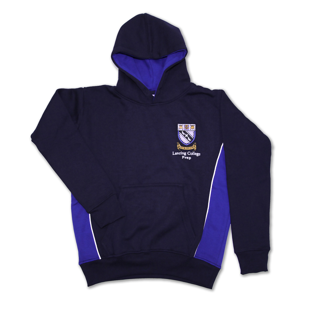 Navy, royal and white hooded top, front pouch pocket, 50% polyester, 50% cotton, bespoke with Lancing College crest and text.