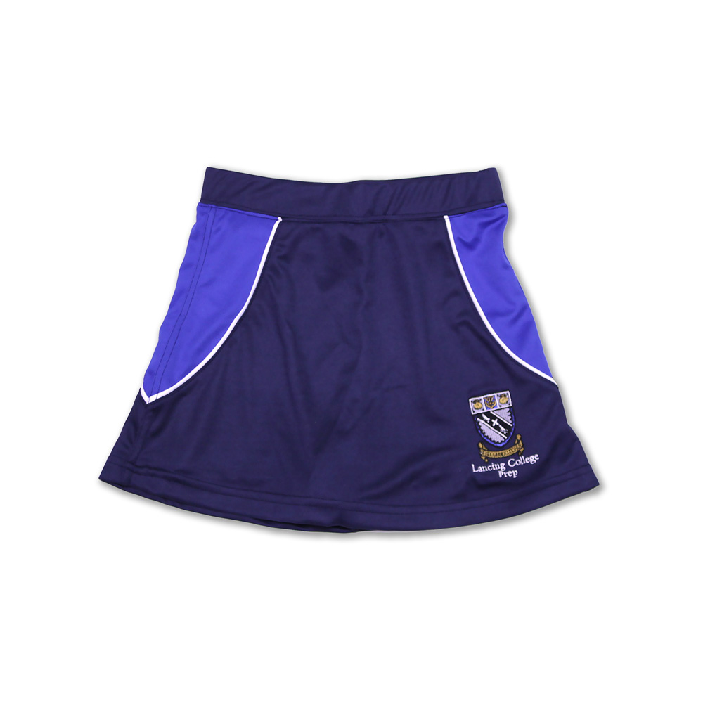 Navy, royal and white skort, elastic waist, hidden shorts under skirt, lightweight sports fabric, 100% polyester, bespoke with Lancing crest and text.