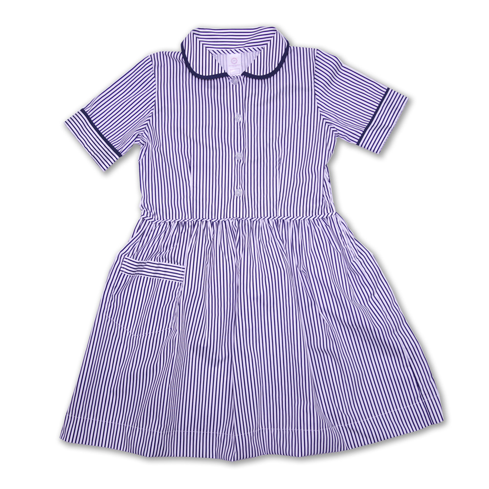 Navy and white striped summer dress, 65% polyester, 35% cotton, 115gsm fabric, Peter Pan collar, button to waist, side pocket, bespoke to Lancing (Summer Term only).